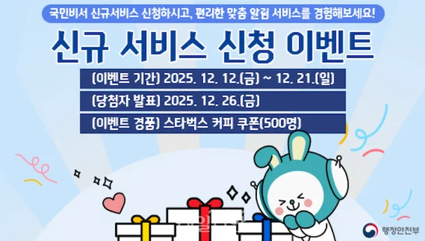 행정안전부는 서비스 확장을 기념해 12월 12일부터 21일까지 ‘국민비서 신규 서비스 신청 이벤트’를 진행합니다. 기간 내 신청자 중 500명을 추첨해 모바일 교환권을 증정합니다. 기존 사용자뿐 아니라 처음 가입하는 국민에게도 동일한 혜택이 주어지므로, 지금 바로 참여해보세요!