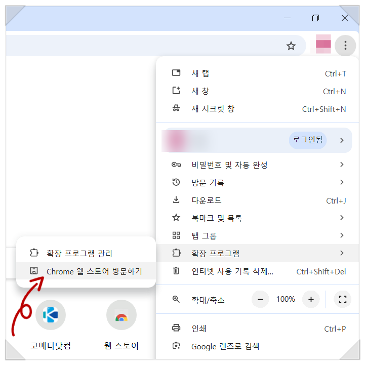- 우측 상단 점 3개(메뉴) 클릭 → "확장 프로그램 > Chrome 웹 스토어 방문" 선택합니다.