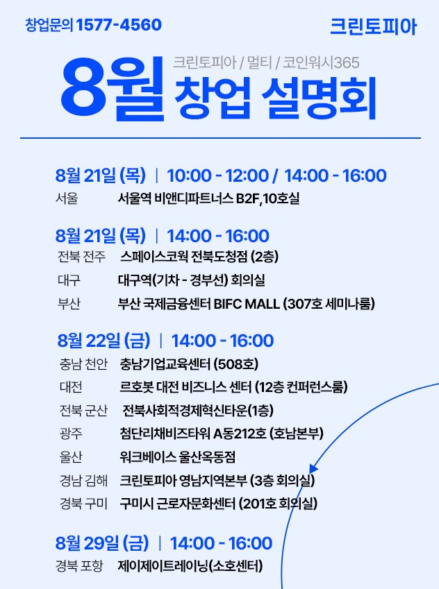 | 8/21(목)~8/29(금) | 크린토피아 창업설명회 (순회) | 전국 12개 지역 순회 · 세탁업 | 공식 |